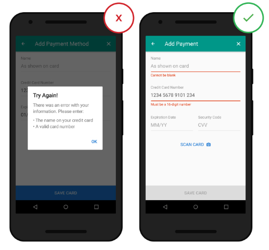 同樣的例子還有錯誤反饋。用戶(hù)在出現錯誤的場(chǎng)景中,大部分用戶(hù)的認知是:我哪里錯了,該如何修正。在下圖中有兩種設計方案: